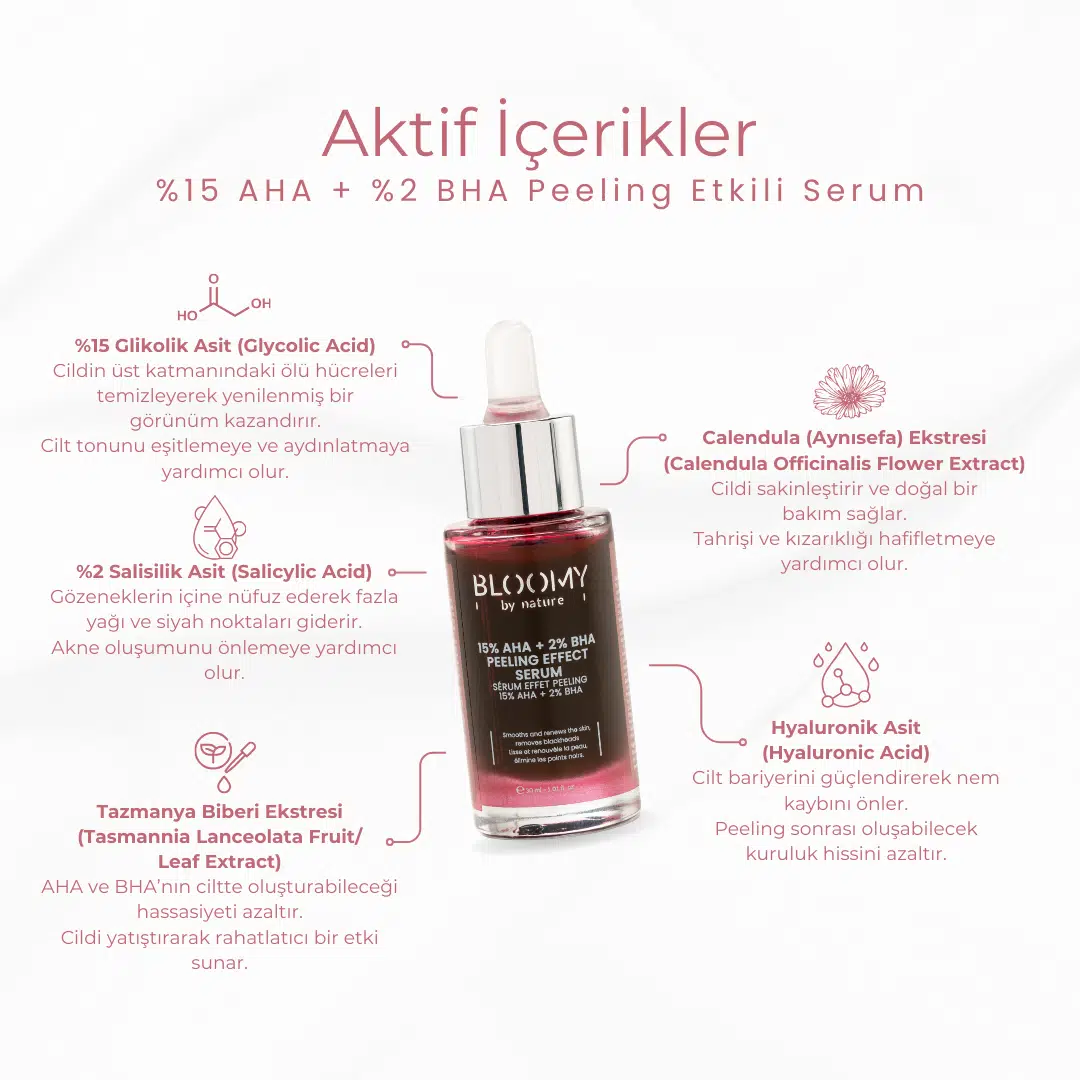 %15 AHA + %2 BHA Peeling Etkili Serum: Kimyasal eksfoliasyon yaparak ölü derileri uzaklaştırır, gözenekleri derinlemesine temizler ve akneye sebep olan tıkanmaları önler. Aynı zamanda cilt yenilenmesini destekler.