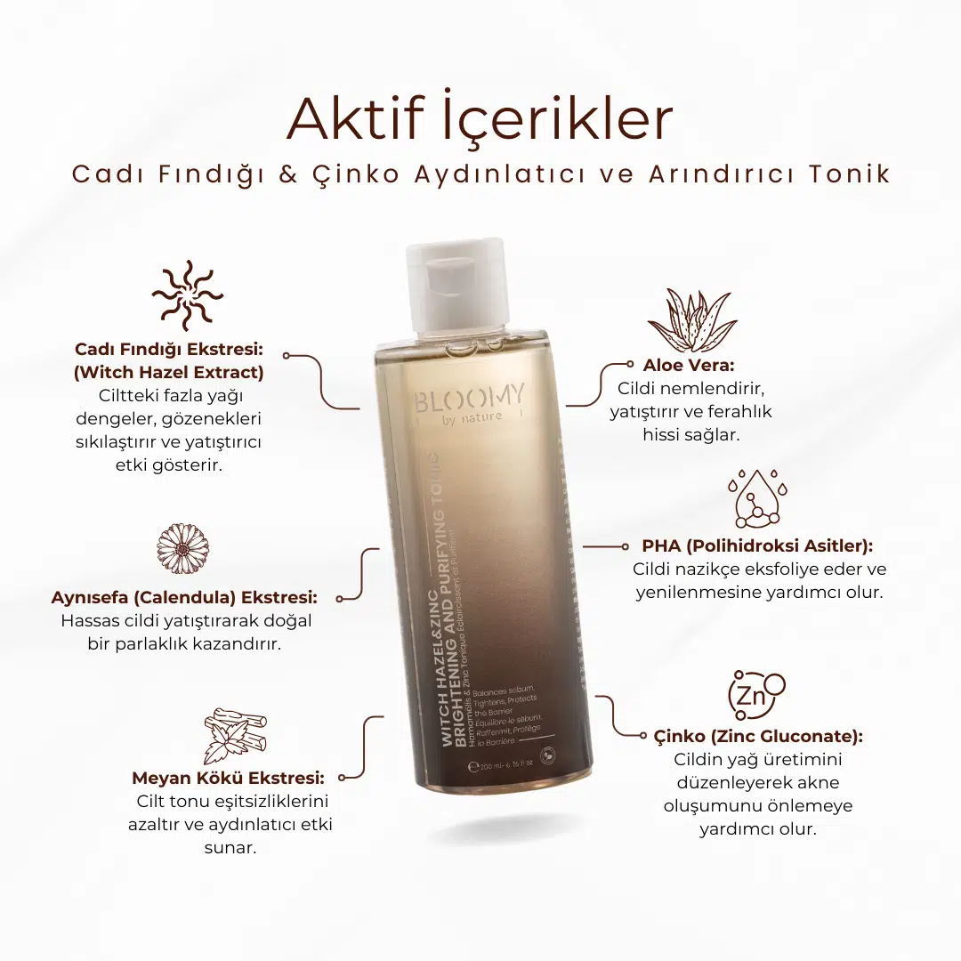 Cadı Fındığı & Çinko Aydınlatıcı ve Arındırıcı Tonik , cildi yatıştırır, gözenekleri sıkılaştırır ve fazla yağı dengeler. Cadı fındığı ekstresi, cildi ferahlatırken arındırıcı cilt tonunu eşitler.