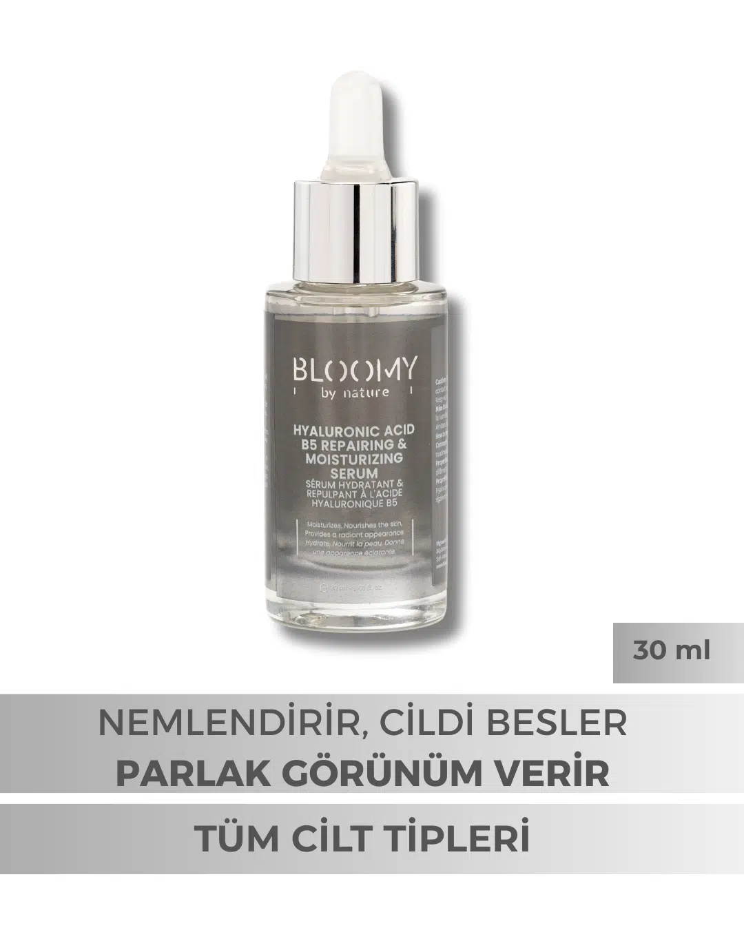 Bloomy by Nature Hyaluronik Asit B5 Onarıcı & Nemlendirici Serum; farklı moleküler ağırlıklara sahip hyaluronik asit çeşitleriyle cildin hem yüzeyine hem de derin katmanlarına yoğun nem sunar. Panthenol ile cildi destekler ve rahatlatır. Bitkisel içerikler olan aslanpençesi ve centella asiatica sayesinde cildin daha esnek, dengeli ve canlı görünmesine yardımcı olur.