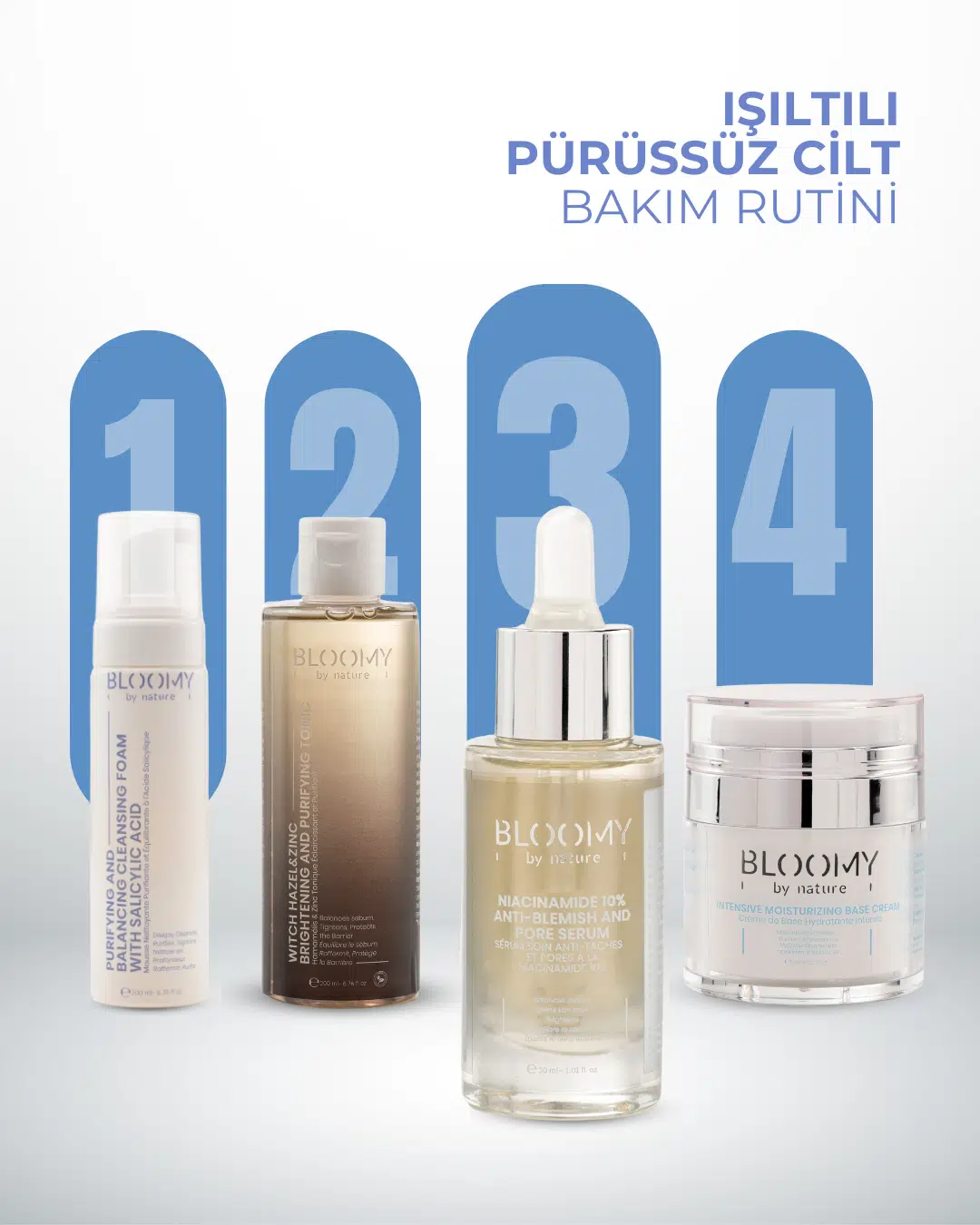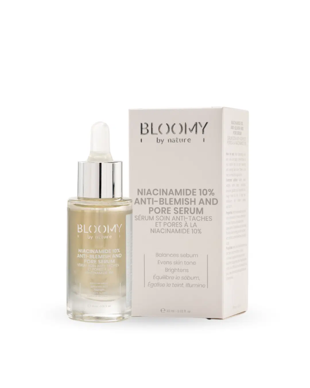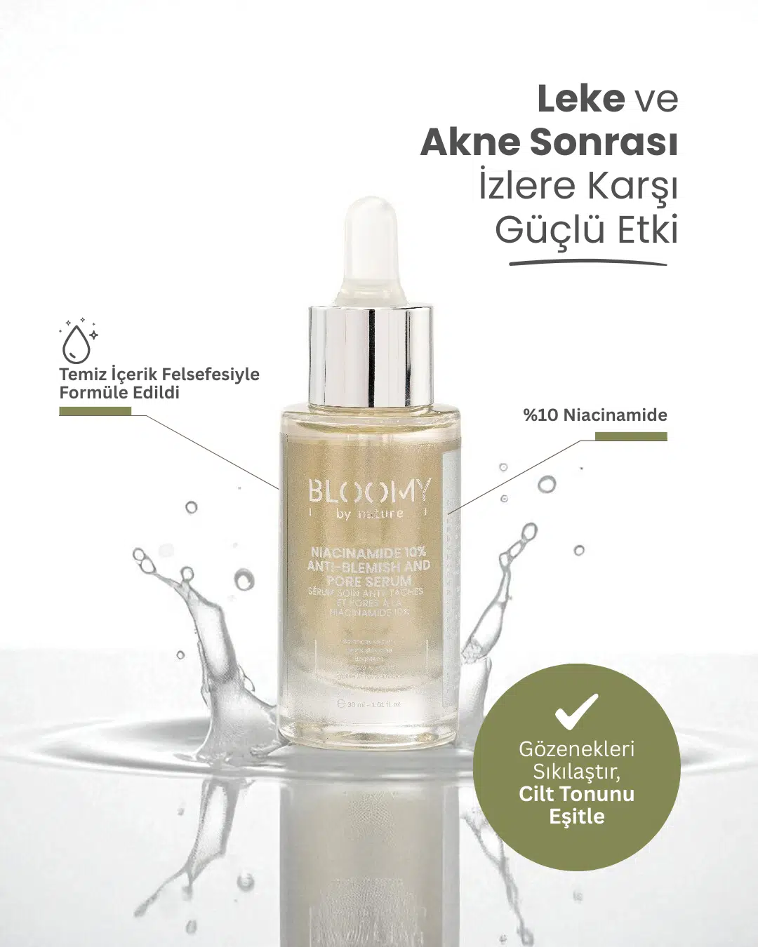 %10 Niasinamid içeriği ile leke görünümünü azaltır ve cilt tonu eşitlenmesine destek olur.; ; Çinko PCA sayesinde cildin sebum üretimini dengeleyerek akneye eğilimli ciltlerin bakımına yardımcı olur.; ; Cadı Fındığı Ekstresi (Hamamelis Virginiana) cildi yatıştırır ve gözenek görünümünü sıkılaştırmaya destek olur.; ; Ak Söğüt Kabuğu Ekstresi (Salix Alba) doğal bir BHA kaynağıdır, cildi nazikçe eksfoliye eder ve yenilenmesine katkıda bulunur.; ; Cildi kurutmadan dengeli bir bakım sunar ve yağlı his bırakmaz.; ; Bloomy By Nature Niasinamid %10 Leke ve Gözenek Karşıtı Serum, ciltteki gözenek görünümünü azaltmaya, lekeleri hafifletmeye ve cilt tonu eşitsizliklerini gidermeye yardımcı olan güçlü bir formüle sahiptir.; %10 niasinamid içeriğiyle bilimsel olarak etkinliği kanıtlanmış bir konsantrasyona sahiptir ve cildi aydınlatmaya destek olur.; Çinko PCA sayesinde cildin sebum dengesini düzenlerken, akneye eğilimli ciltler için ideal bir bakım sunar.; Ayrıca, cadı fındığı (Hamamelis Virginiana) ve ak söğüt kabuğu (Salix Alba) ekstreleri ile cildi yatıştırır ve yeniler.
